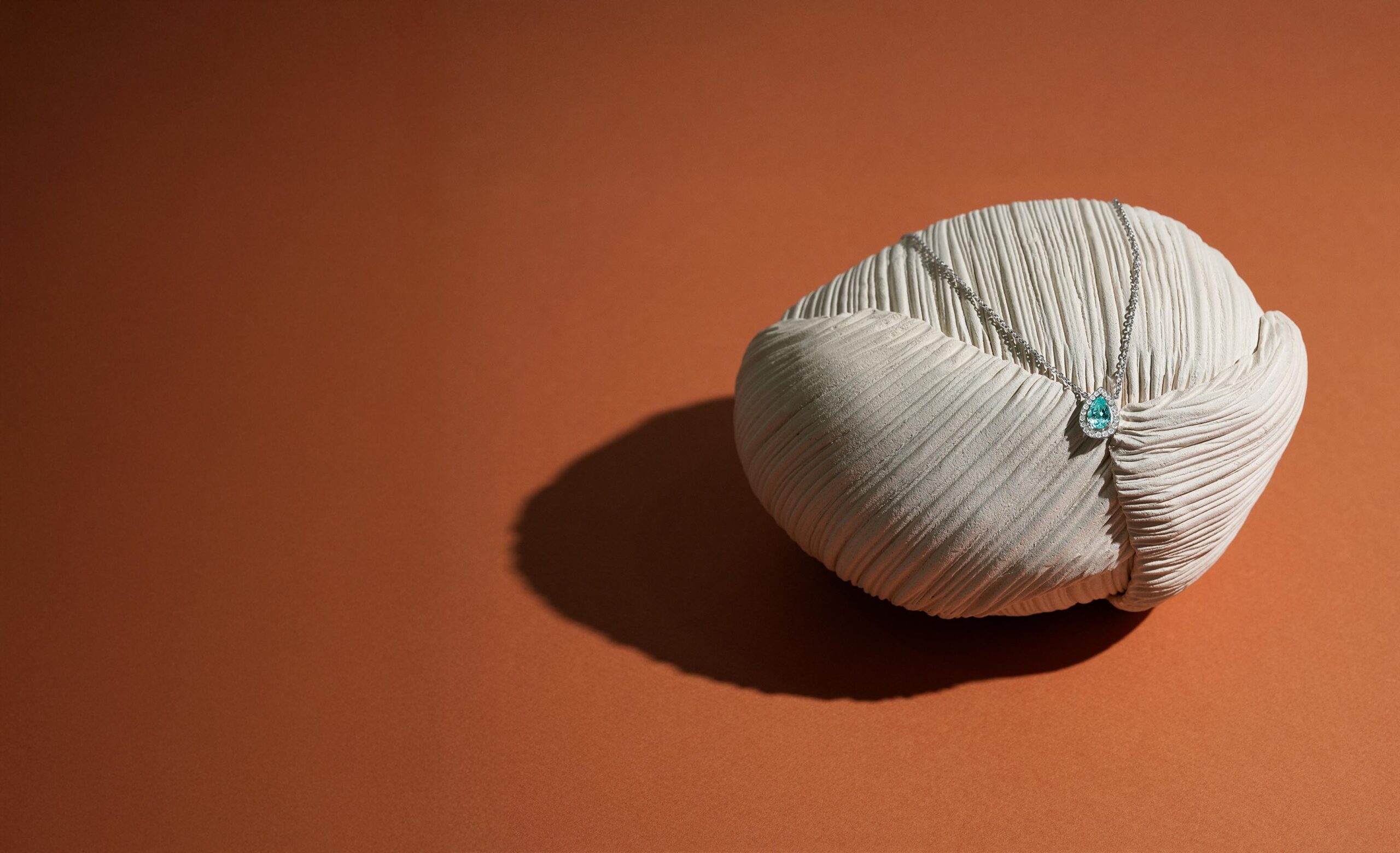 Se trata de un colgante de oro blanco de Ley (750M) cuyo centro lo protagoniza una turmalina Paraíba talla lágrima de 1.66 cts. de peso total. Está decorado por una orla de diamantes talla brillante de origen natural, un total de 20 brillantes en disminución desde la base en 1.70 mm hasta la cúspide en 1.35 mm, sumando un peso total aproximado de 0,30 cts.