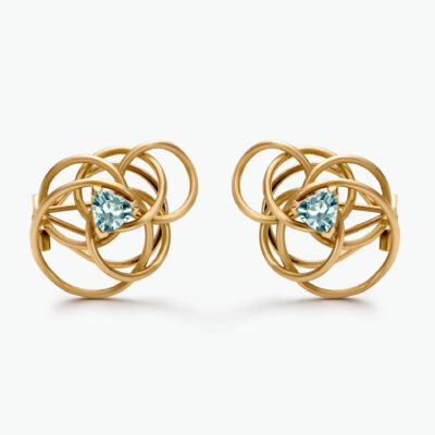 Pendiente realizado en oro rosa de Ley acabado matizado, cuyo centro lo ocupa una aguamarina natural talla trillion de 5,2mm y un peso total aproximado de 1,45cts sumando ambas.
