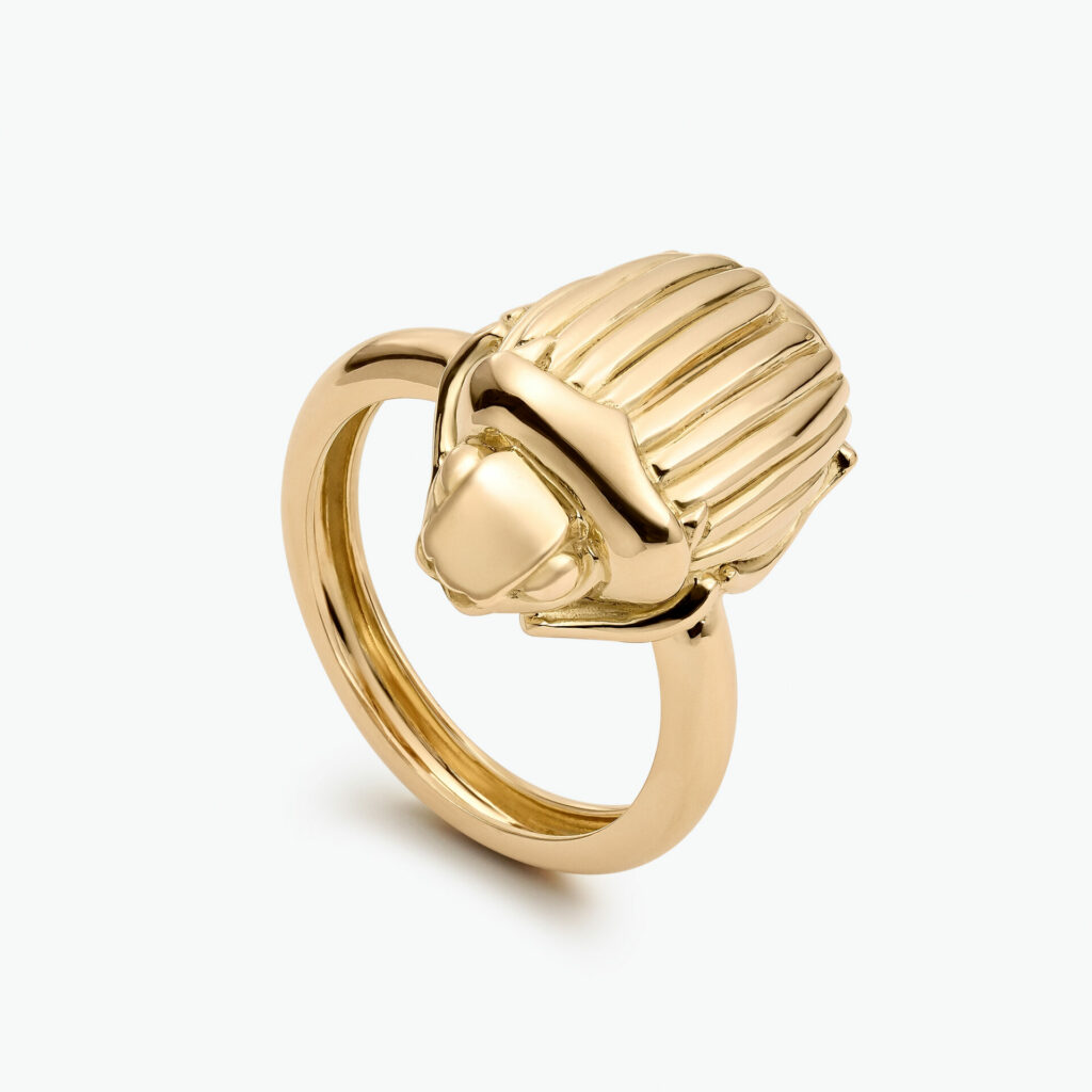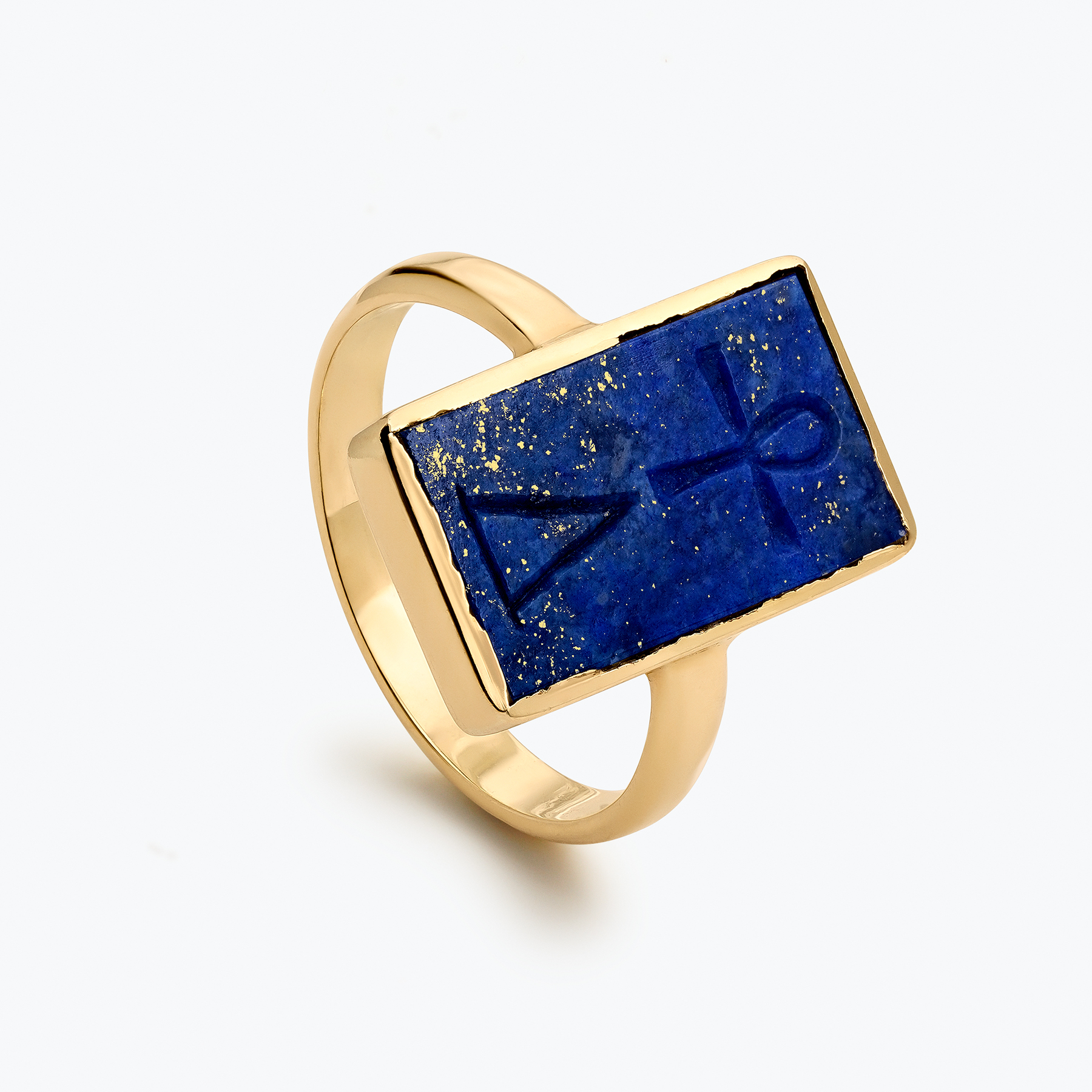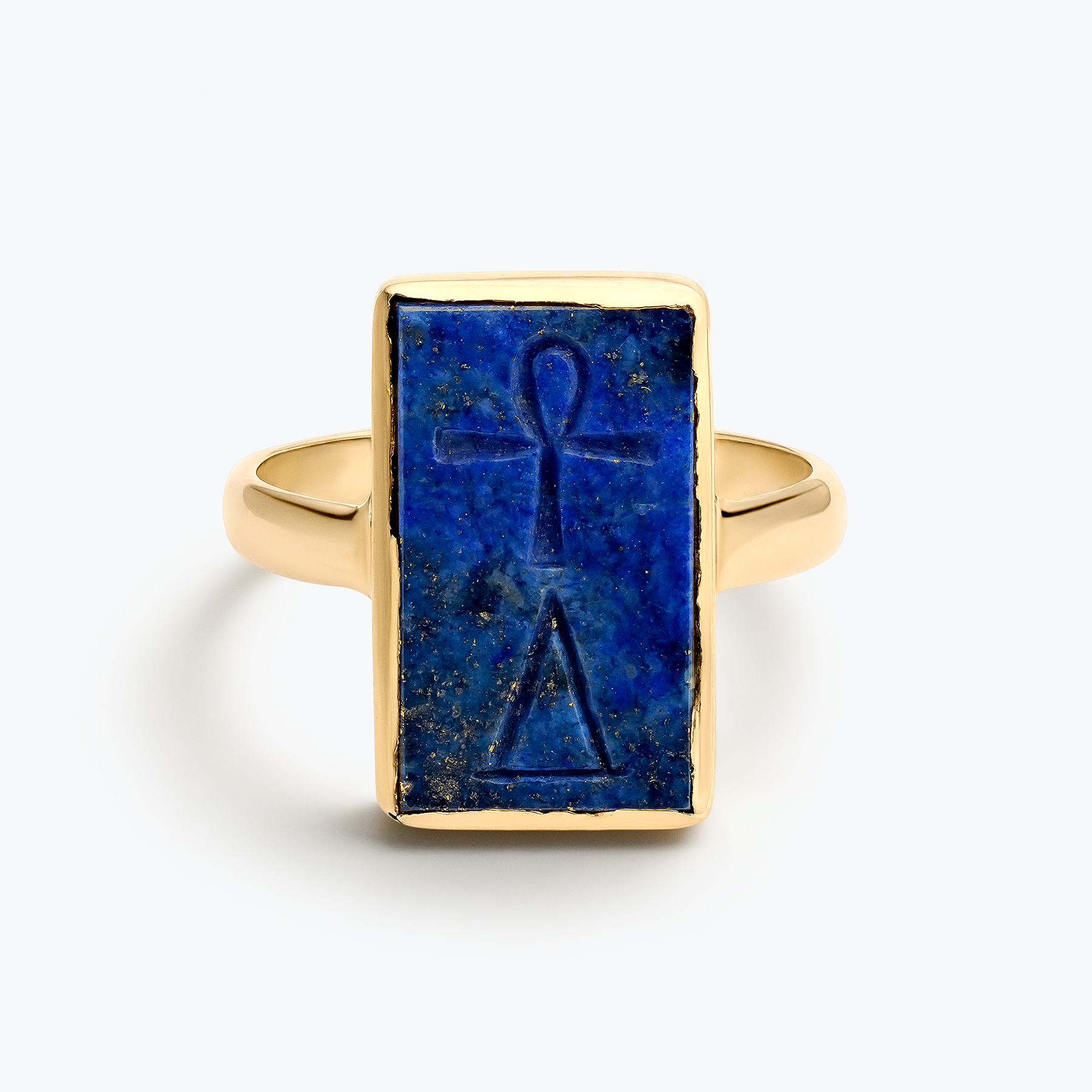 Sortija tipo Sello de oro amarillo de 18 kts cuyo centro lo ocupa un lapislázuli natural rectangular con grabado en bajorrelieve donde se encuentra representada la llave de la vida eterna,y el triángulo: la unión del Cielo y la Tierra. Ligando ambos atributos