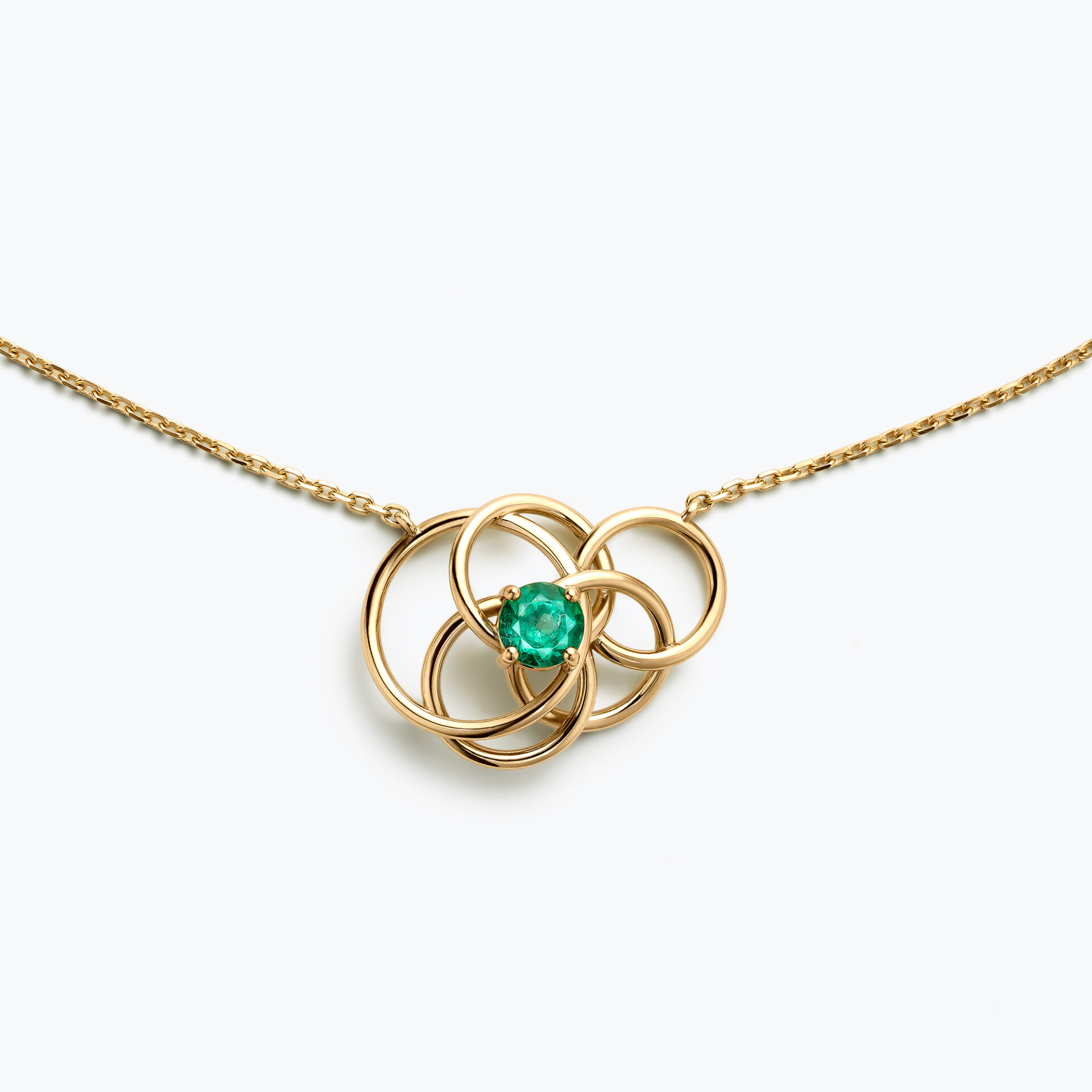 Colgante realizado en oro amarillo de Ley acabado brillo, cuyo centro lo ocupa una esmeralda natural de origen Colombia, talla redonda de 5,5mm de diámetro y 0,71 quilates de peso.