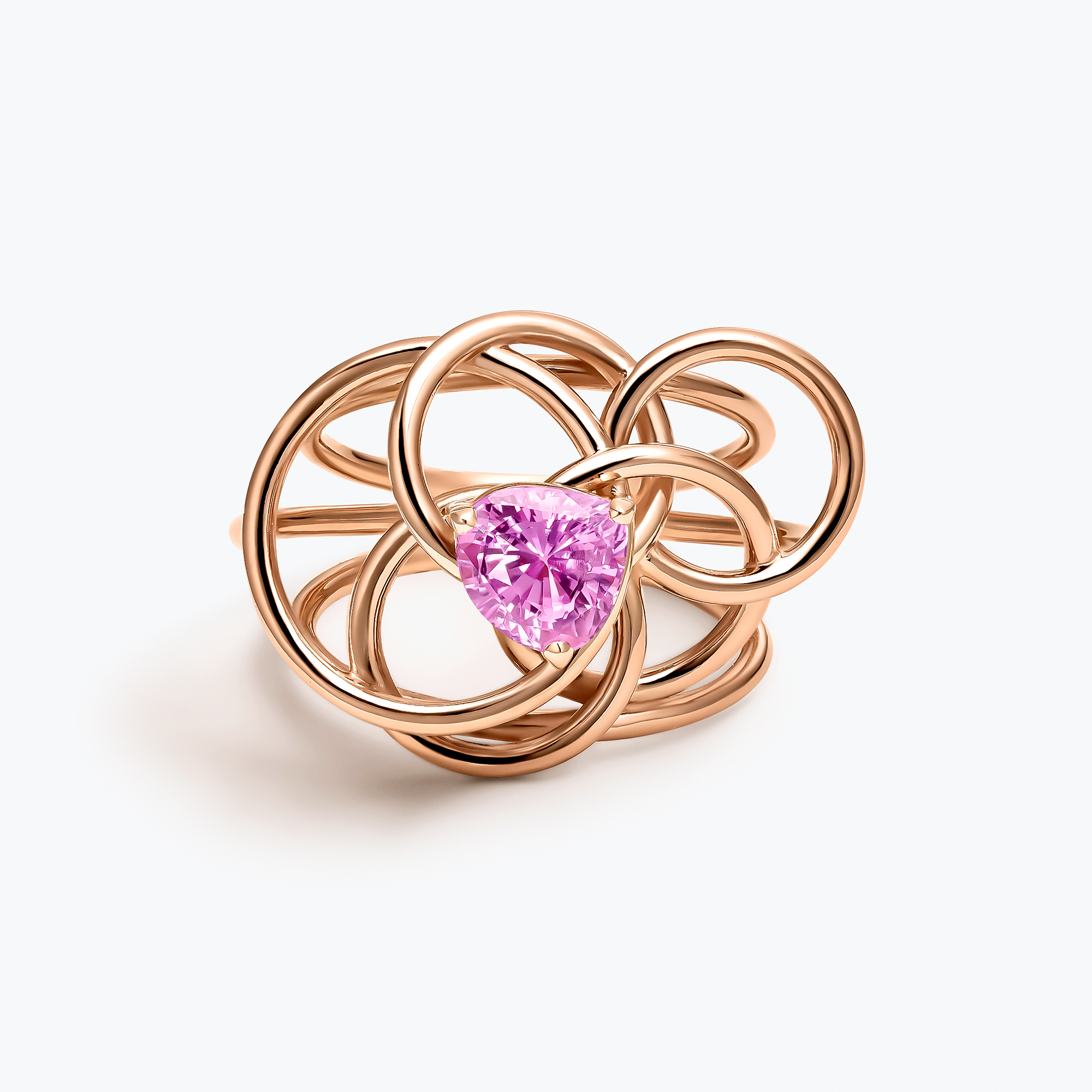 Sortija realizado en oro rosa de Ley acabado brillo, cuyo centro lo ocupa un zafiro natural fancy rosa avioletado talla perilla de 6 x 6 cm de diámetro y 1,50 ct. de peso unitario total aproximado.